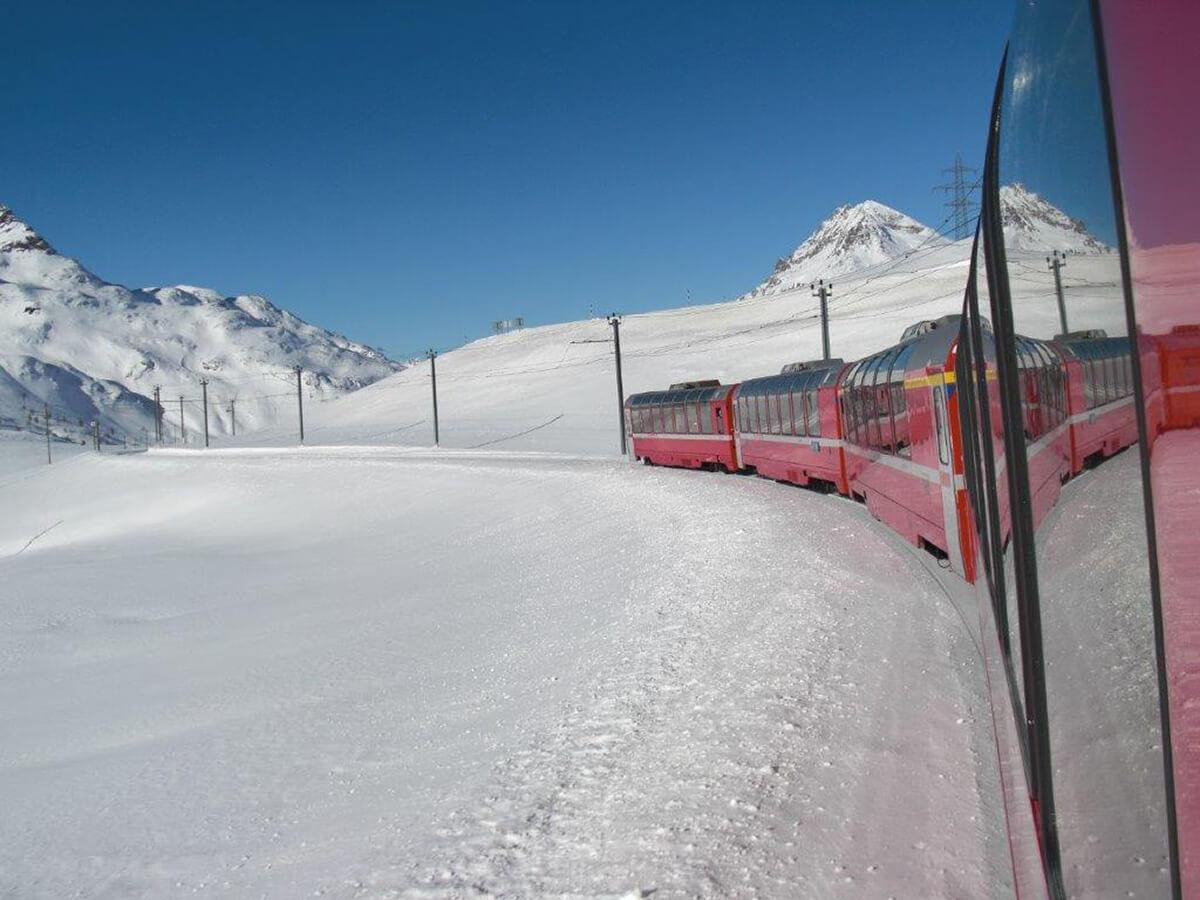 Morgens fahren wir mit dem komfortablen Bernina-Express vorbei an Diavolezza und über den Bernina-Pass, einen der schönsten Alpenübergänge der Schweiz.